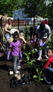 As I’ve blogged before: Community gardens are growing in popularity, especially in places where wholesome foods, such as fresh fruits and vegetables, are not available or are too expensive. Basically, an available lot is divided up among interested residents and/or groups/clubs. Someone who knows something about gardening coordinates and teaches, so that participants end up with a steady flow of food and flowers. Of course, donations of tools, plants, seeds, soil are sought to make it all happen. Community gardens get people outside, get neighbors working together, provide better food at a lower price, raise awareness about nutrition and food production, and put an empty or nuisance lot to good use.