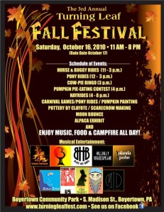 The Boyertown Community Park will be the setting for this weekend’s Turning Leaf Fall Festival, which will include performances from local bands and a variety of activities for kids and families. The event will be Saturday, October 16th from 11am to 8pm with a rain date of Sunday. According to the festival’s website, www.turningleaffest.com, the schedule of events is as follows: