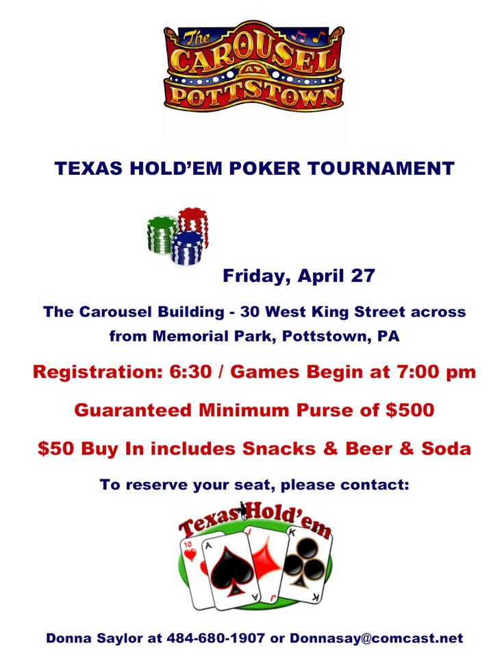 See the details below for a Texas Hold ‘Em tournament that’s taking place TONIGHT at The Carousel at Pottstown. And click here for Evan Brandt’s blog post about it. Oh… and click here if you want to hear Kenny Rogers sing about knowing when to hold ’em and knowing when to fold ’em!