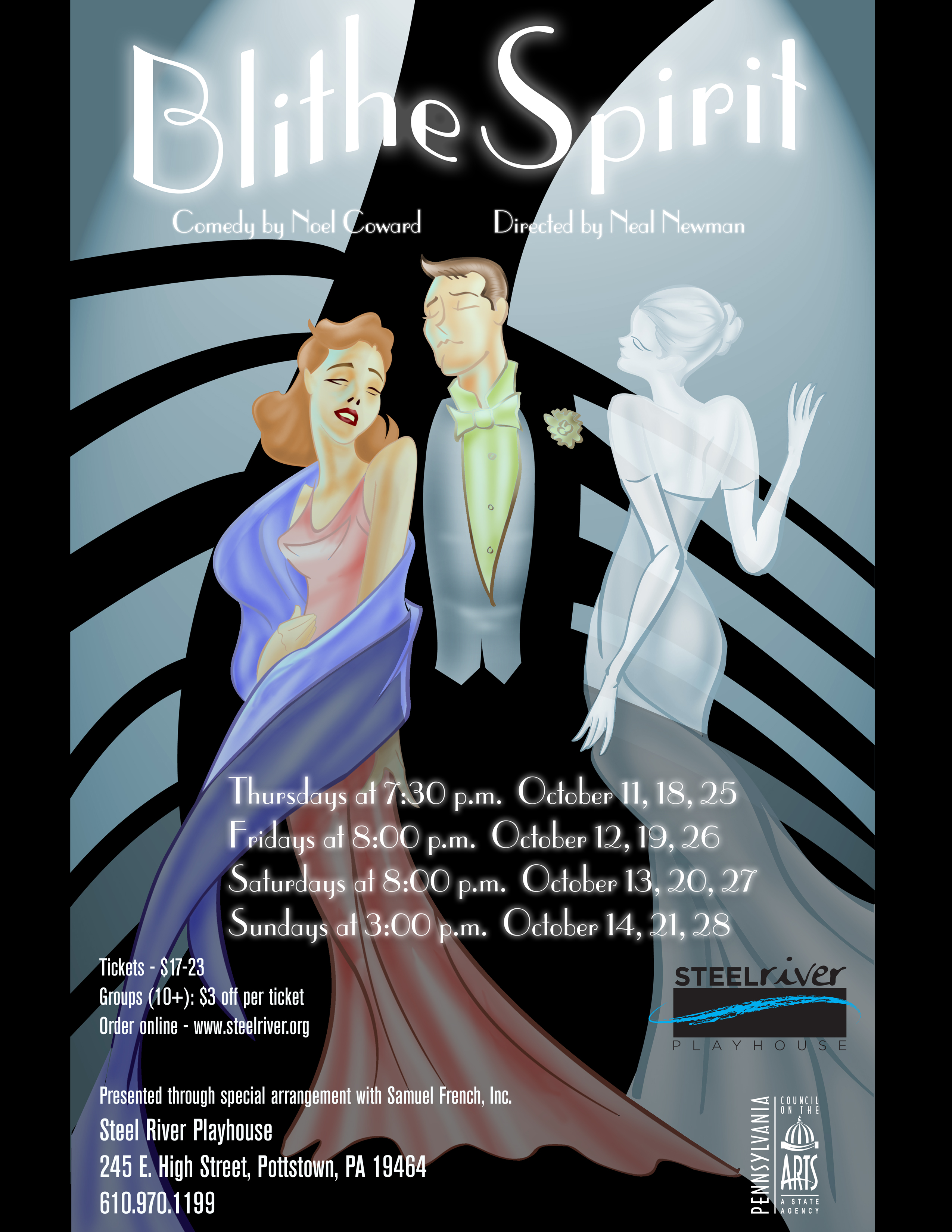 Blithe Spirit will be performed Thursdays (October 11, 18, 25 at 7:30PM), Fridays (October 12, 19, 26 at 8PM), Saturdays (October 13, 20, 27 at 8PM) and Sundays (October 14, 21, 28 at 3PM) on the Main Stage.  Special Event: Sunday, October 14 – Talkback with the director and cast.   Tickets range from $17-$23.  More information and a ticketing link are available at www.steelriver.org or by calling 610.970.1199.