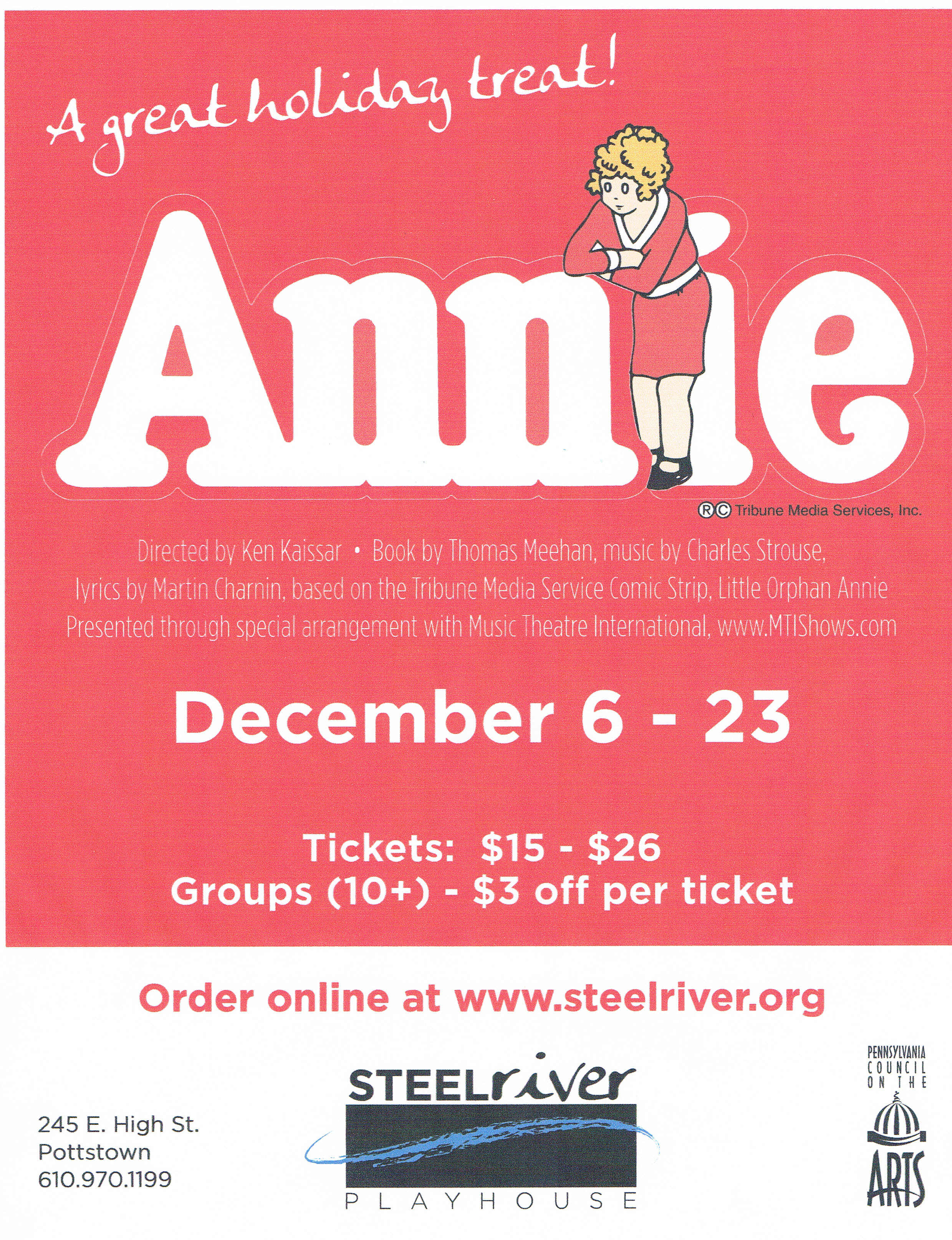 Formerly Tri-County Performing Arts Center (Tri-PAC), Steel River Playhouse, a 501(c)(3) charitable organization, seeks to strengthen community, inspire creative exploration, educate, and entertain, through the presentation of quality performing arts events and education for diverse audiences. Each year, the Steel River Playhouse produces more than 90 performances and hosts more than 10,000 people as audiences, students, artists, donors and volunteers from throughout the region. We offer performance opportunities through open auditions; theater technical training; acting, voice, and instrumental lessons; classes and workshops for all ages; summer camp programs; and educational outreach including scholarships, artists in the classroom, traveling children’s shows, and other initiatives. For further information, visit www.steelriver.org, or call 610-970-1199.