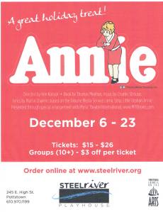 Annie, a uniquely American story about survival, pluck, second chances, generosity and triumph, opened at Steel River Playhouse this past Thursday. This Broadway sensation, ripped from the pages of a comic strip, won three Tony Awards.