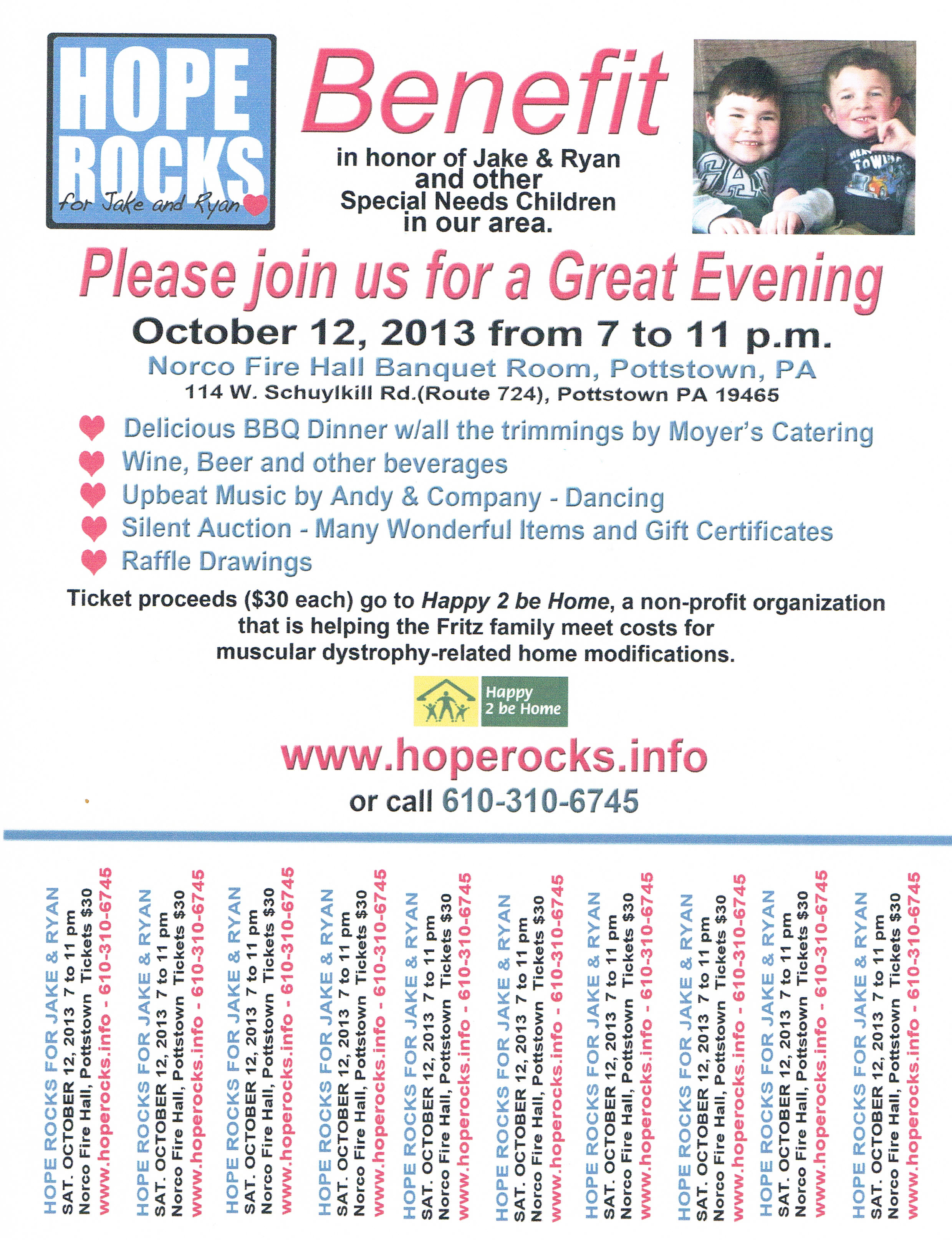 Lauren and John Fritz and friends are holding a benefit to raise funds for home renovations related to their sons, who both suffer from Duchenne Muscular Dystrophy. More info is available at www.hoperocks.info. There is also a facebook page and blog at Hope Rocks for Jake and Ryan.