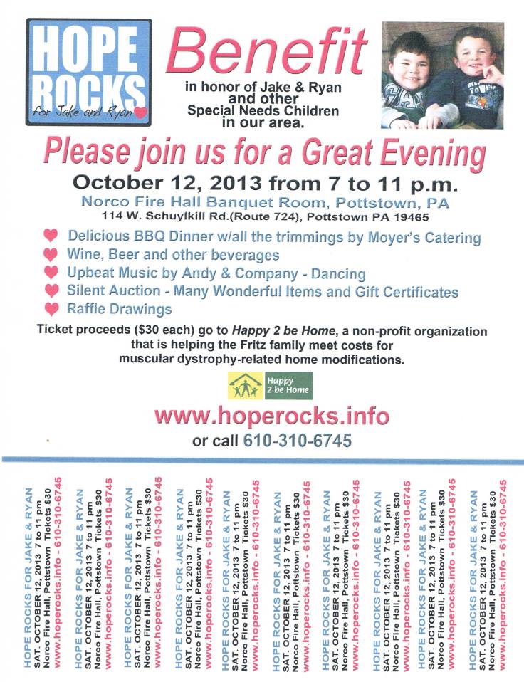 The Hope Rocks for Jake and Ryan Benefit will be Saturday, October 12th, 7-11 pm at the Norco Fire Hall Banquet Room. The night will include a BBQ dinner by Moyer’s Catering, live music by Andy & Company, and a Silent Auction with many wonderful items, Tickets are $30. All proceeds go to Happy 2 be Home, and will help them to create an accessible home for Jake and Ryan.