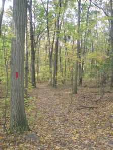On my first visit to Coventry Woods, I was alone on a Sunday afternoon. I found an access point at 2145 Coventryville Road, at the intersection with Chestnut Hill Road. After climbing an unpaved, steep incline in my car, the terrain leveled off and I came to a grassy parking area. From there, I could continue on foot in the same general direction or go off to the right, past a pavilion, down a trail clearly marked by bright red rectangles on tree trunks. I decided on the marked path, although there wasn’t a trail map at the trail head, so I didn’t know if the trail looped around or how long it was. I wasn’t comfortable heading off into the great unknown by myself, but I figured I’d at least walk a little ways to see what I could see.Red trail, Coventry Woods