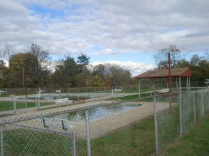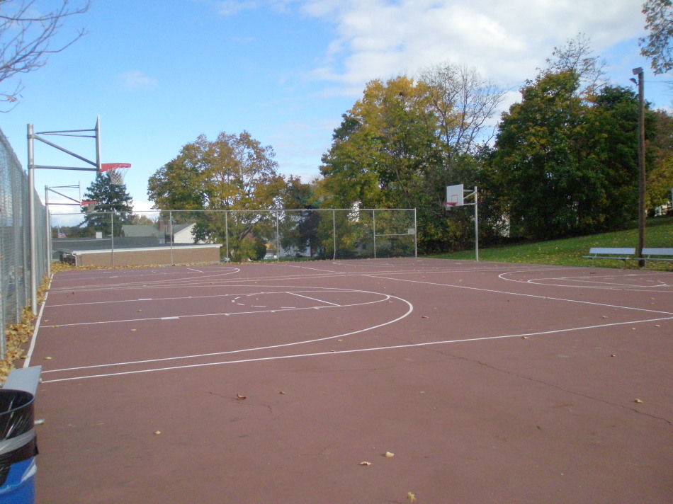 My first stop was Borough Hall because I knew that Hall Street Park was adjacent to it, but I also needed some directions to two other parks. To get to the park itself, just go around the right side of Borough Hall and head up Hall Street. It’s got a decent incline, so just be forewarned. On your left, you’ll see the two full-court basketball courts, which are in excellent condition. The fencing on two sides ensures that your ball won’t be sailing down to the sidewalk and street below (as long as your shooting or passing isn’t too erratic!) The fairly steep-sloped grassy open space beyond the courts is probably really good for sledding, but perhaps not for ball games. There are a few benches under some trees that might make a nice shady spot for summertime reading. Spring City Pool