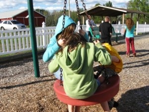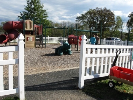 My oldest daughter played fall ball for Pine Forge last year, and my younger kids loved the Conestoga wagon, the swings and the old metal slide that made up the lower playground. They were a little disappointed to find that the slide has now been replaced with a less heat retaining plastic version, but they were thrilled to find that the metal merry-go-round was still there. I guess some play equipment can really stand the test of time because they pick that lower playground over the newer equipment pretty much every time we visit the park.