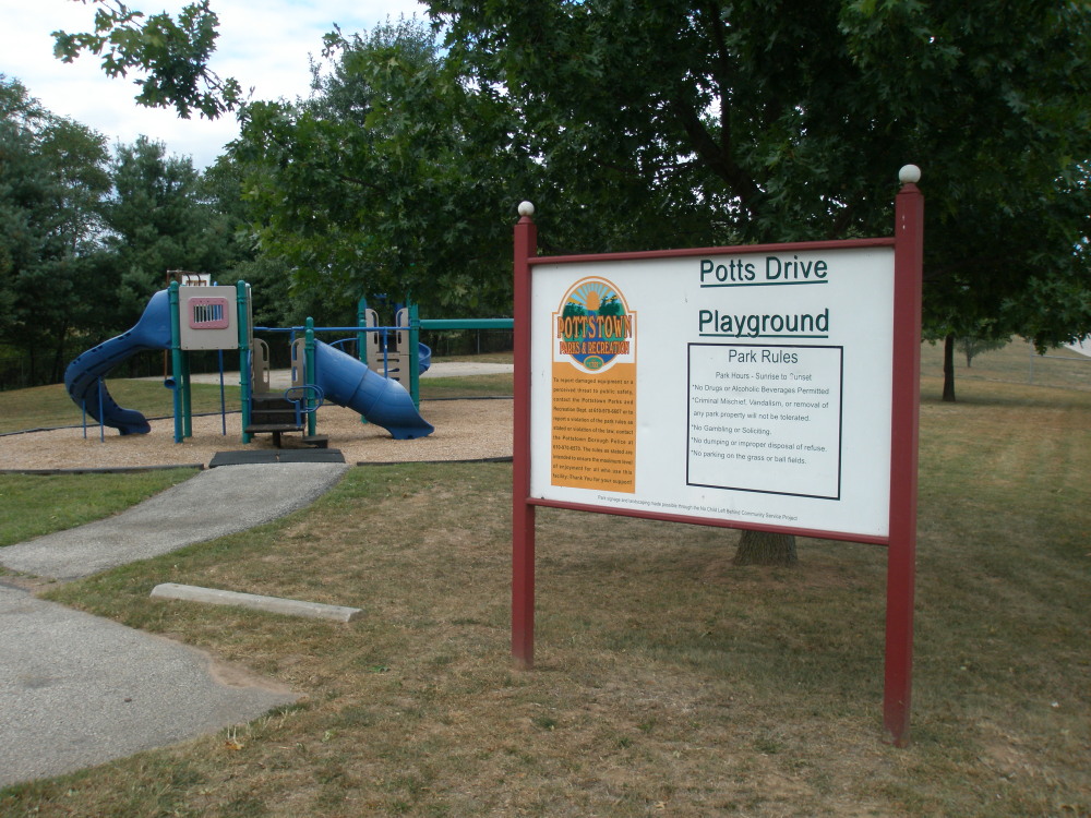 POTTS DRIVE PARK Location: At the end of Potts Drive, Pottstown, PA 19464. Although it is behind WalMart, it can only be accessed via Potts Drive; there is no through street to Shoemaker Rd. Size: 0.5 acres Suitability: Playground will appeal to 5-12 year olds. Basketball court will appeal to older children, teens & adults. Facilities: Playground, multi-purpose open space, benches, shade trees, full-court basketball. Activities + tips: There is no access to the parking area. Entrance is accessible for pedestrians, wheelchairs & bicycles. Hours: Dawn until dusk.